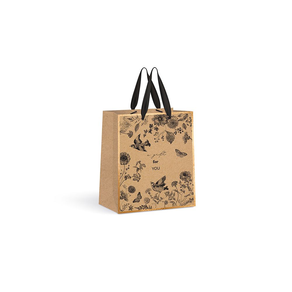 Wykonana z naturalnego, wytrzymałego papieru kraft 150 g. Wzmocniony, sztywny spód. Eleganckie i przyciągające wzrok, złote detale. Uchwyty wykonane z czarnego sznurka. Idealna do szybkiego i efektownego pakowania prezentów. Wymiary: 26,5x33x13 cm.