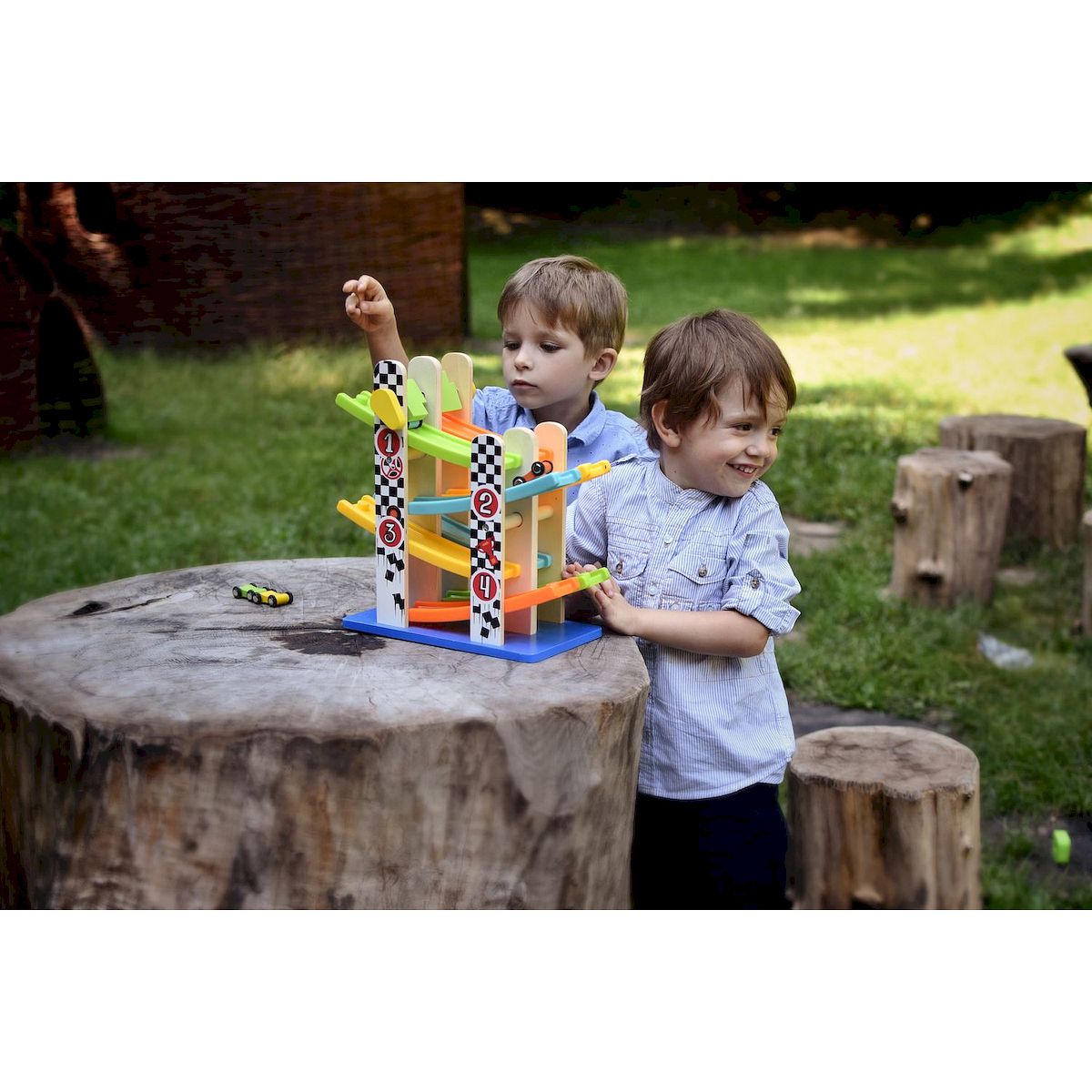 Zjeżdżalnia z Autami to tor wyścigowy z 4 poziomami zjeżdżalni. Ustawiając auto na najwyższym poziomie zjeżdżalni, dziecko może obserwować, jak zjeżdża ono ku dołowi. Tor wyścigowy dla dzieci jest skonstruowany tak, że wszystkie cztery auta mogą zjeżdżać jeden po drugim. Podczas zabawy można podziwiać akrobacje małych wozów i imponującą prędkość.