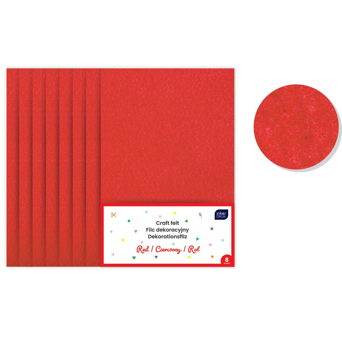 Opakowanie zawiera 8 arkuszy filców w rozmiarze A4 w czerwonym kolorze.