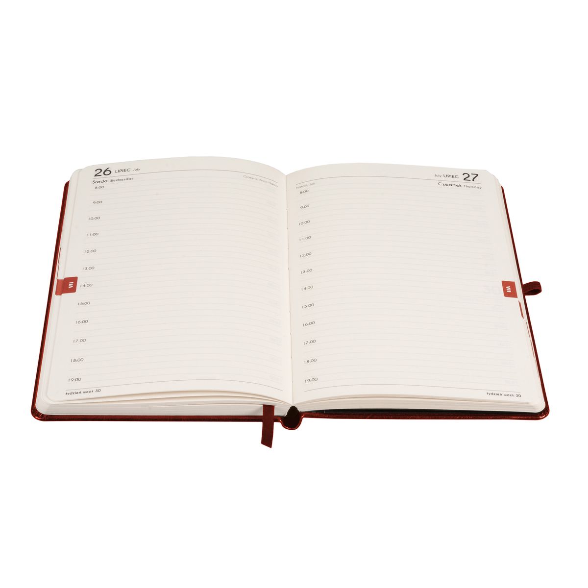 format A5, oprawa: twarda, materiał: ekskluzywna skóra ekologiczna, papier: 80g, kolor papieru: ecru, pionowa gumka zamykająca, gumka na długopis, zaokrąglone rogi, wyklejka z ozdobnego czarnego papieru, koperta na luźne karteczki, wstążka w kolorze okładki, dodatkowe strony: skrócony kalendarz 2022-2024, plan roku 2026, ważne wydarzenia, notatnik oraz skorowidz adresowy, 352 strony, 210x145 mm