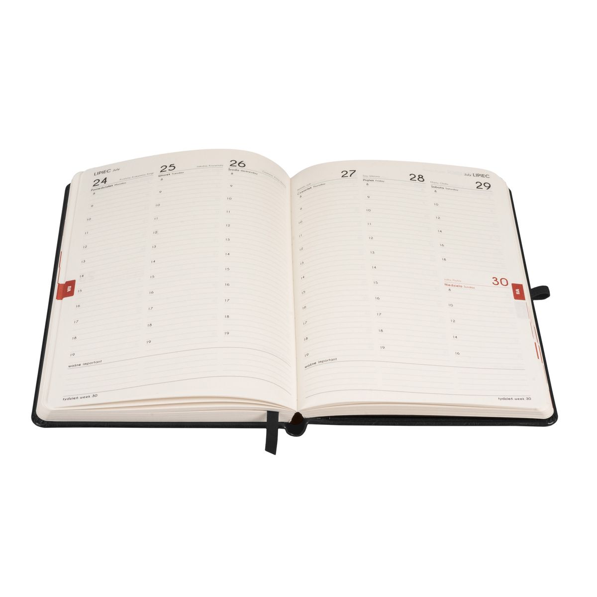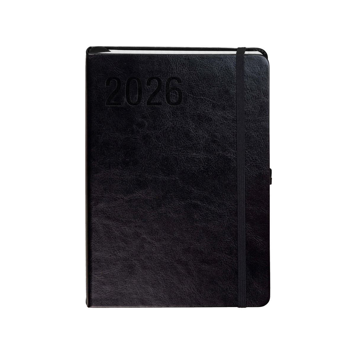 format A5, gramatura: 80 g, liczba stron: 144, okładka: twarda, materiał: skóra ekologiczna, wymiary: 90x140 mm, wnętrze: TDW tydzień do wglądu, pionowa gumka zamykająca, gumka na długopis, zaokrąglone rogi, wyklejka z czarnego papieru ozdobnego, koperta na luźne karteczki, wstążka w kolorze okładki, zawiera dodatkowo: skrócony kalendarz 2025-2027, plan roku 2026, ważne wydarzenia, notatnik oraz notatnik A-Z