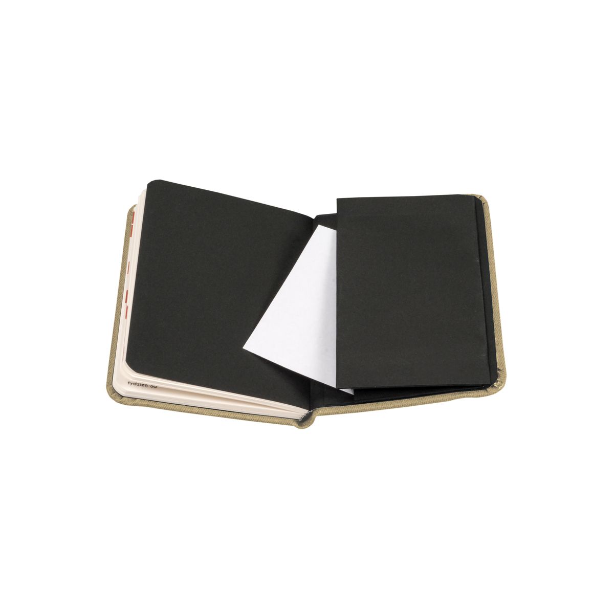 format A7, oprawa: twarda, materiał: ekskluzywna skóra ekologiczna, papier: 80g, kolor papieru: ecru, pionowa gumka zamykająca, zaokrąglone rogi, wyklejka z ozdobnego czarnego papieru, koperta na luźne karteczki, wstążka w kolorze okładki, dodatkowe strony: skrócony kalendarz 2025-2026, plan roku 2026, ważne wydarzenia notatnik oraz skorowidz adresowy, 144 strony, 110x78 mm
