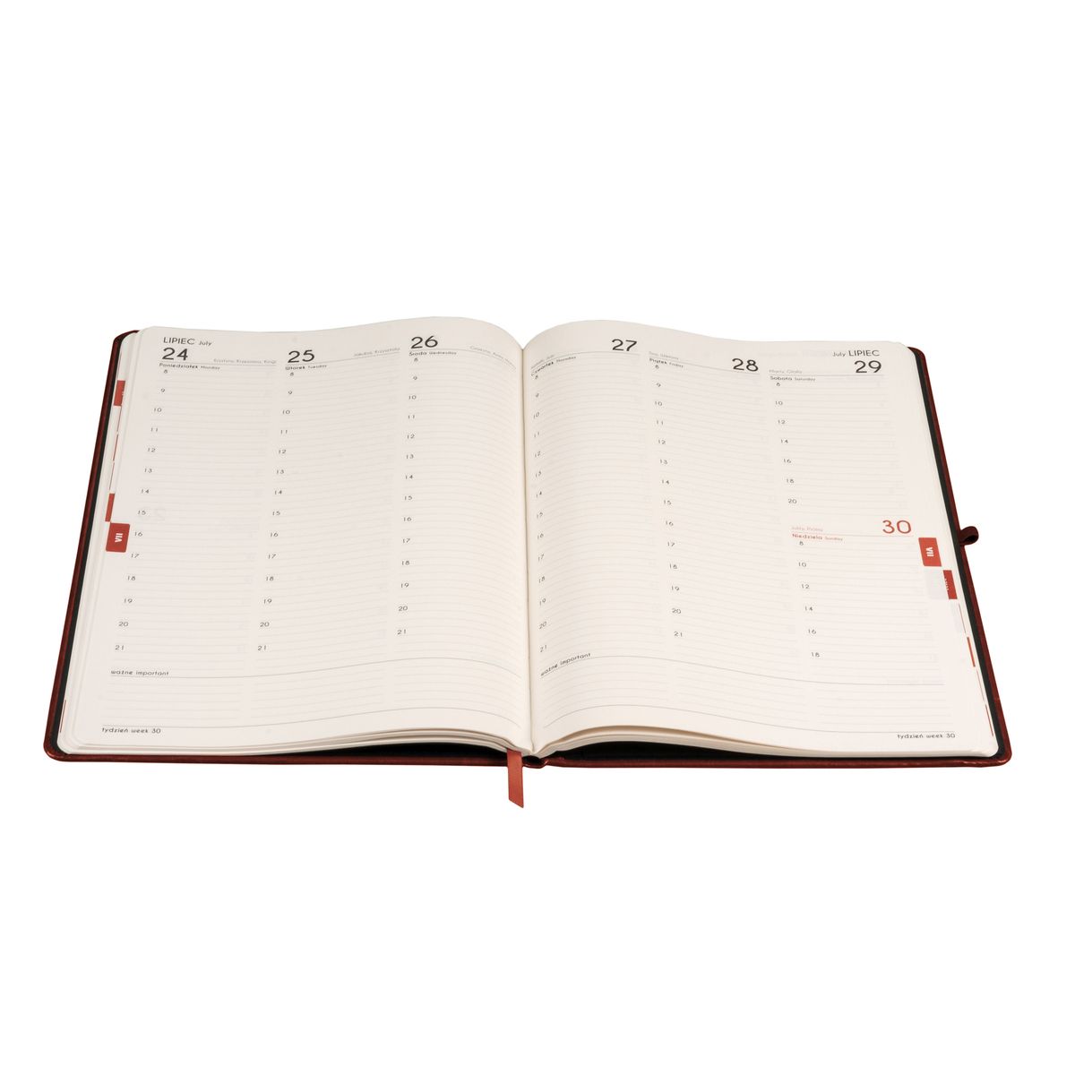 format A4, oprawa: twarda, materiał: ekskluzywna skóra ekologiczna, papier: 80g, kolor papieru: ecru, pionowa gumka zamykająca, gumka na długopis, zaokrąglone rogi, wyklejka z ozdobnego czarnego papieru, koperta na luźne karteczki, wstążka w kolorze okładki, dodatkowe strony: skrócony kalendarz 2022-2024, plan roku 2026, ważne wydarzenia, notatnik oraz skorowidz adresowy, 144 strony, wymiary 295x210