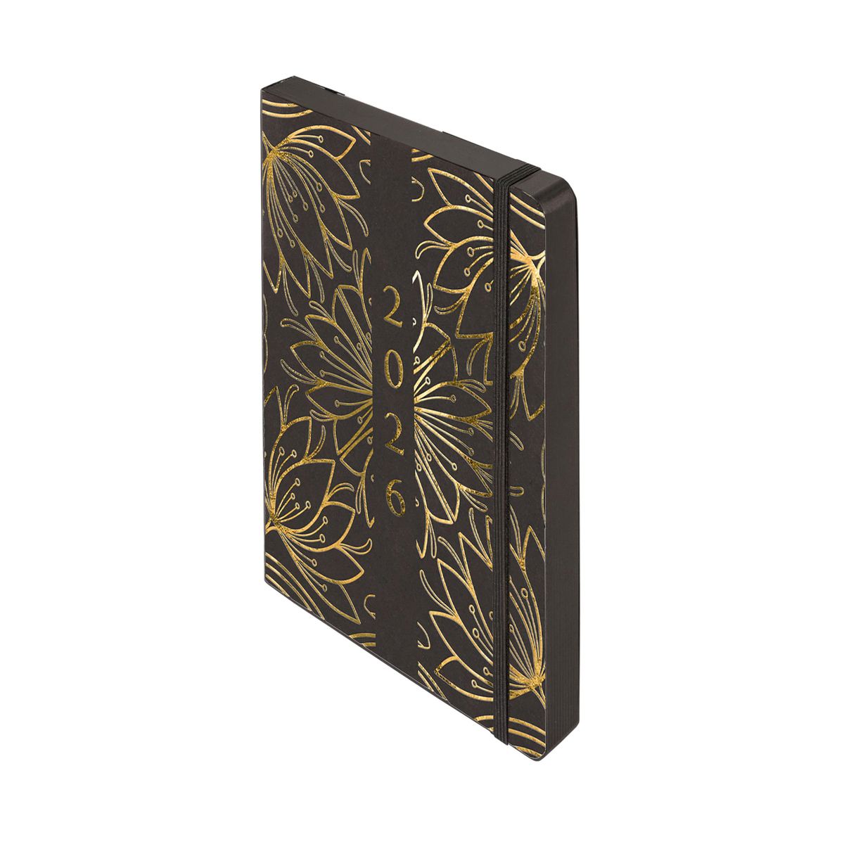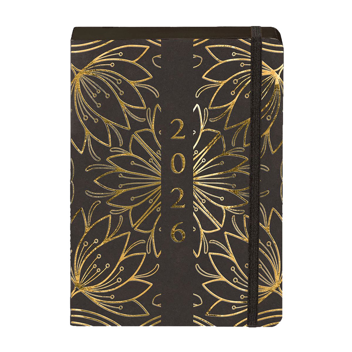 format: A5, wymiary okładki: 207x141 mm, układ: dzień na stronie, ilość stron: 352, oprawa: miękka, materiał: papier, gramatura papieru: 80g, kolor papieru: chamoise, dodatki: plan roku 2026, ważne wydarzenia, skorowidz adresowy, notatki, pionowa gumka zamykająca: czarna, wstążka: czarna, zaokrąglone rogi, wyklejka: czarna