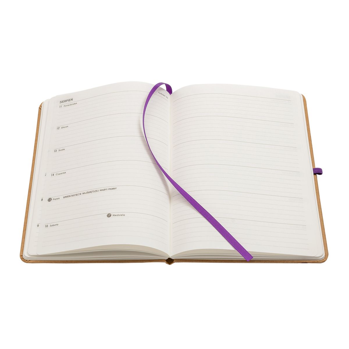 format: A5, wymiary okładki: 210x144 mm, układ: dzień na stronie, ilość stron:144 , oprawa: twarda z wyczuwalną strukturą , materiał: papier, gramatura papieru: 80g, kolor papieru: chamoise, dodatki: plan roku 2026, skorowidz adresowy, notatki, pionowa gumka zamykająca: wstążka: bordo, czarny, wyklejka: czarna