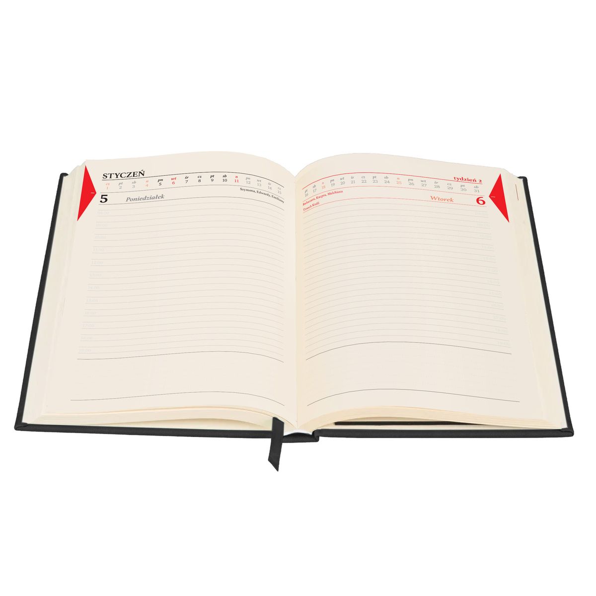 format A5, oprawa: twarda, materiał: Vivella, papier: 70g, kolor papieru: ecru, wyklejka z ozdobnego papieru ecru, koperta na luźne karteczki, wstążka w kolorze okładki, dodatkowe strony: skrócony kalendarz 2025-2027, plan roku 2026, notatnik oraz skorowidz adresowy, 350 stron, osobno sobota niedziela
