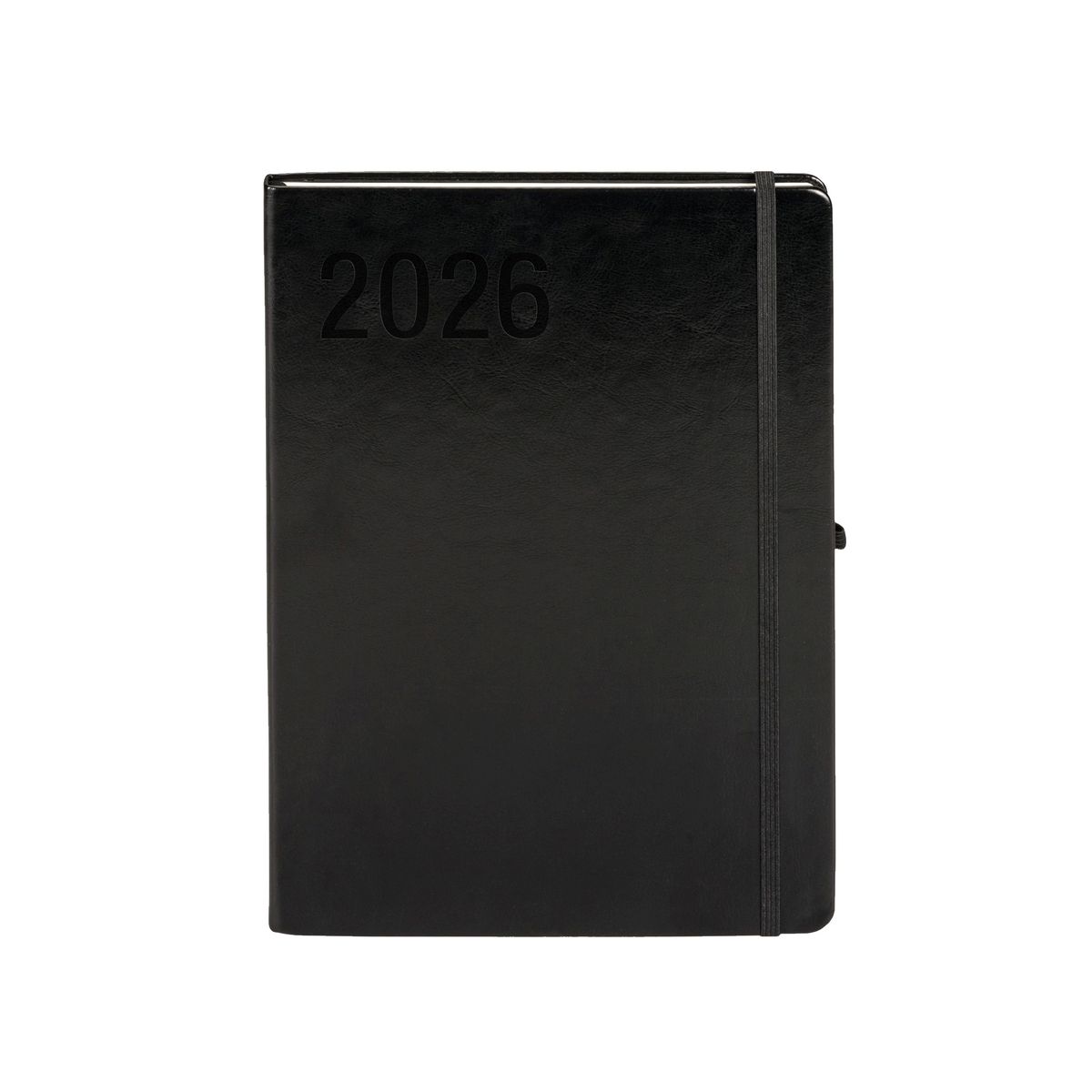 format A4, oprawa: twarda, materiał: ekskluzywna skóra ekologiczna, papier: 80g, kolor papieru: ecru, pionowa gumka zamykająca, gumka na długopis, zaokrąglone rogi, wyklejka z ozdobnego czarnego papieru, koperta na luźne karteczki, wstążka w kolorze okładki, dodatkowe strony: skrócony kalendarz 2022-2024, plan roku 2026, ważne wydarzenia, notatnik oraz skorowidz adresowy, 144 strony, wymiary 295x210