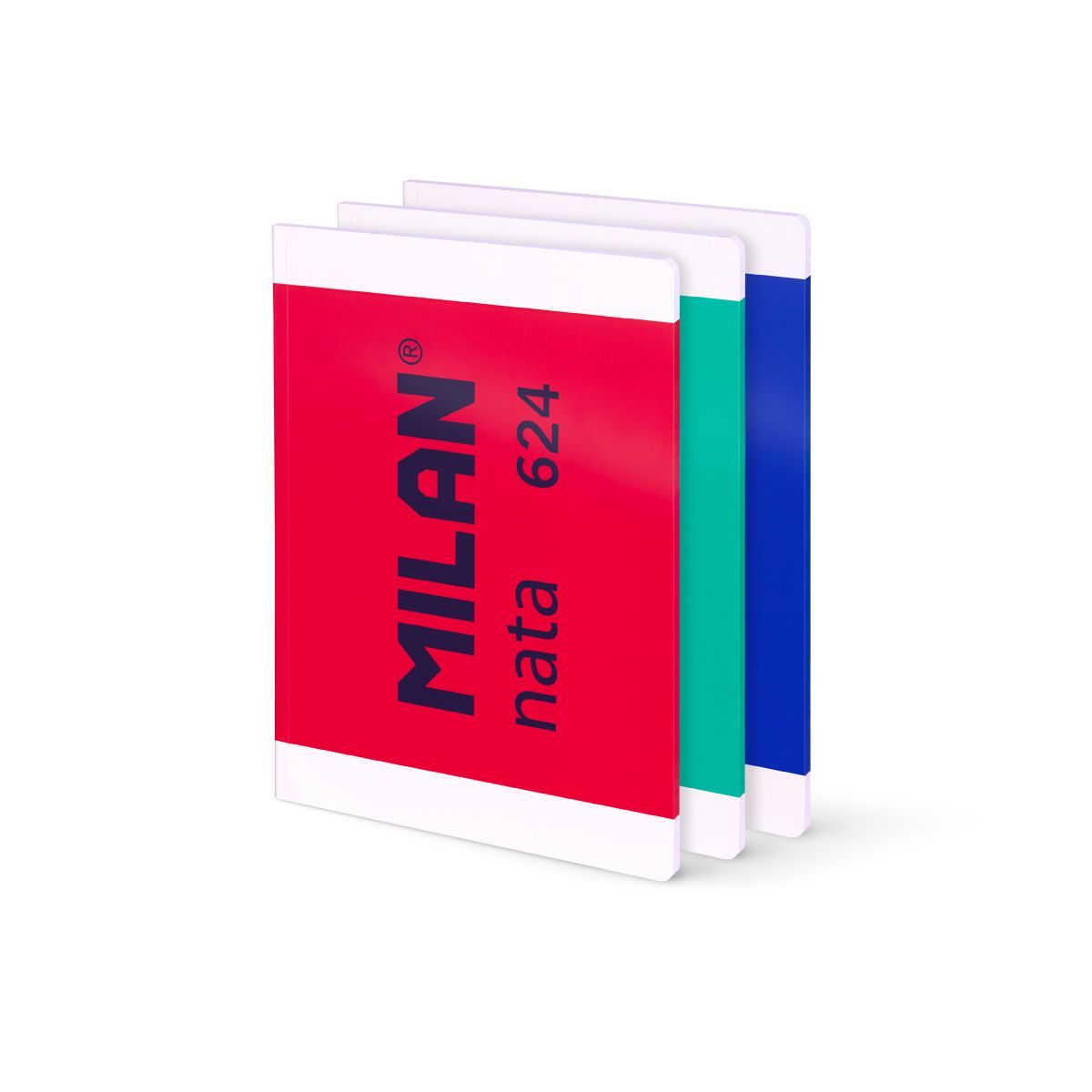 Zestaw 3 zeszytów notesów klejonych A4, papier gładki, 48 kartek. Kolory: niebieski, zielony i różowy. Elastyczna kartonowa okładka w dwóch różnych wykończeniach - błyszczącym i matowym. Wysokiej jakości papier o gramaturze 95 gr/m², mikroperforowany. Kolekcja MILAN nata® 624 inspirowana jest oryginalną kolorystyką i designem gumek MILAN produkowanych w Hiszpanii od 1918 roku. Wymiar: 29,7 x 21 x 2,1 cm · 1,05 kg