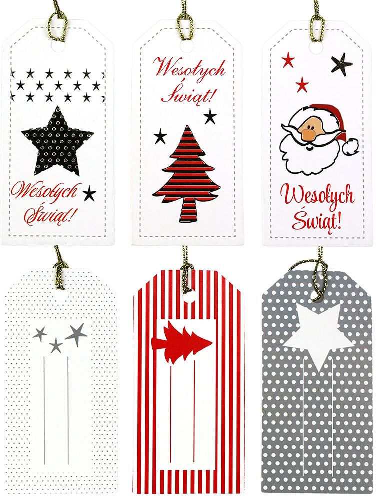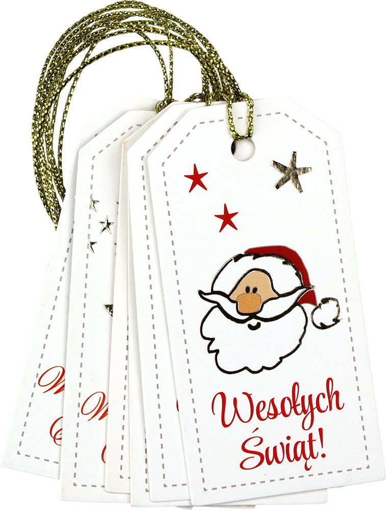 Zawieszki prezentowe z napisem „Wesołych Świąt”, wymiary: 40x80 mm, 3 wzory: gwiazdka, głowa Mikołaja, choinka, dwustronny zadruk z miejscem do wypełnienia. 6 sztuk.