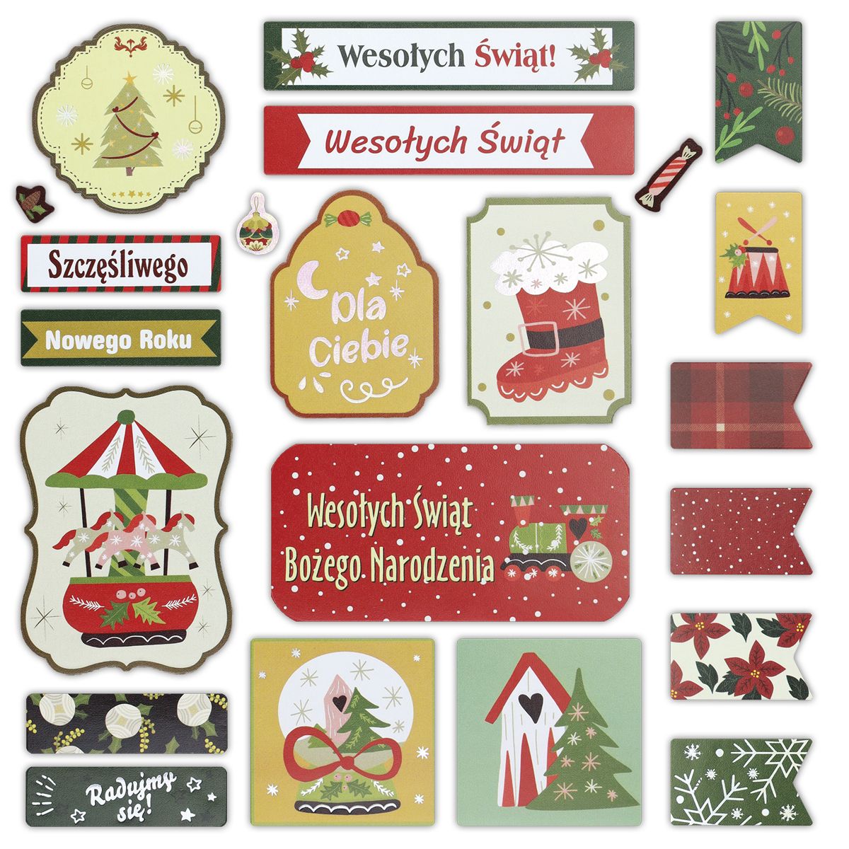 Naklejki papierowe, wzory do scrapbookingu i dekoracji prezentu: życzenia w języku polskim, zakładki, metalizowane elementy. 2 plansze - 22 sztuki.