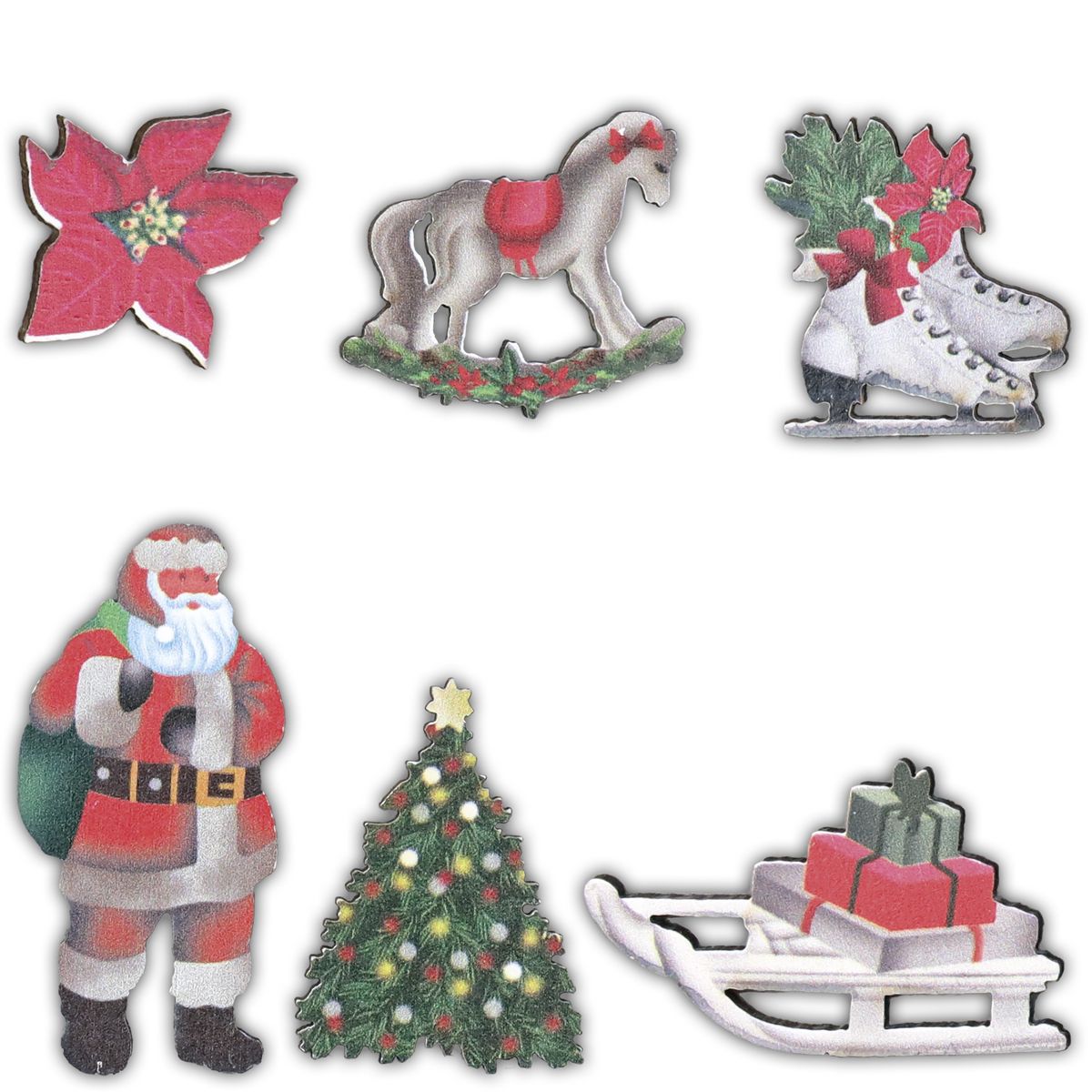 Drewniane dekoracje w drewnianym pudełku, 6 wzorów Boże Narodzenie: sanki z prezentami, łyżwy, Mikołaj, koń na biegunach, choinka, poinsecja. 36 sztuk.