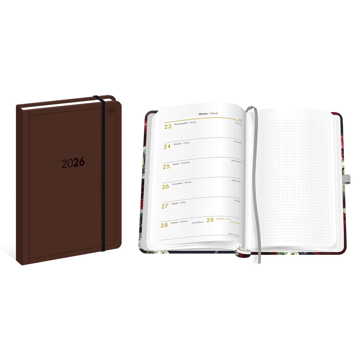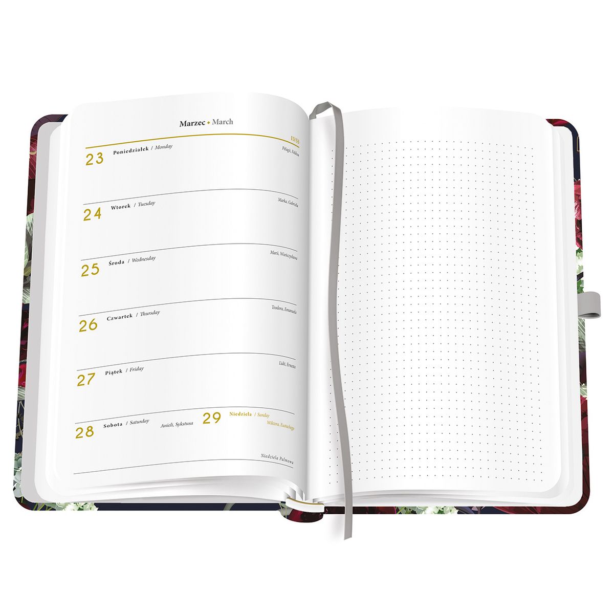 kalendarium: 1 tydzień na dwóch stronach miejsce na notatki przy każdym dniu twarda oprawa zamykany na gumkę papier 80 g okładka metaliczna lub matowa z lakierem wybiórczym kolorowa wyklejka tasiemka do zaznaczania strony