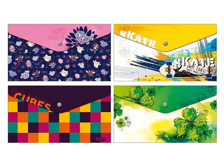 PP teczka kopertowa na zatrzask, wymiar DL (225x125mm), kolorowy mix, wytrzymałość materiału 0,21mm.